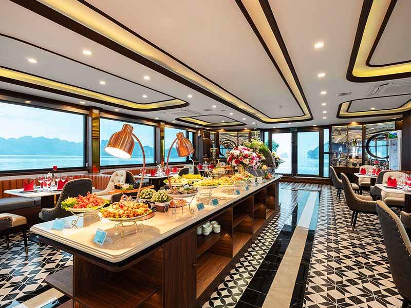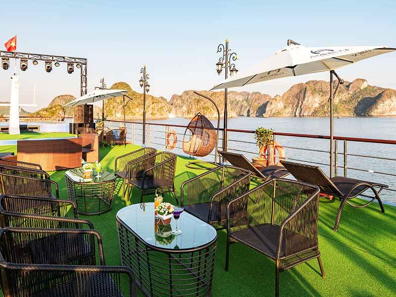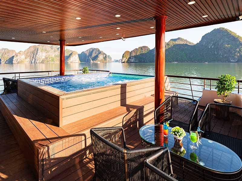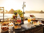 16:30: After that, you will get back to the cruise and ready for our Sunset Party. Vietnamese tea, cake, fresh fruits, and snacks will be served when you're relaxing on the sundeck or in the infinity pool. The cruise will pass by the islands of Ha Long Bay on the way back.