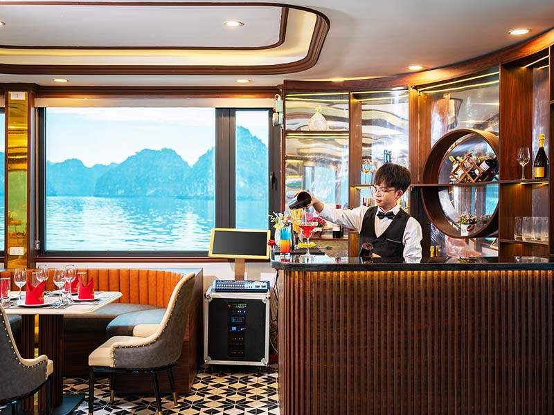11:30 - 12:00: When arriving at Halong International Cruise Port you are welcomed with a nice smile from our staff, you will check in, get on the board, enjoy a welcome drink, when the manager or tour guide introduces the itinerary before discovering Halong Bay.