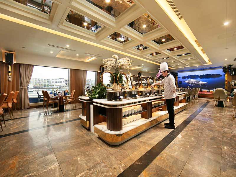 13:30: Savor a carefully curated gourmet menu crafted by talented Vietnamese culinary experts at the elegant Bayview Dining Restaurant. Guests can indulge in exquisite dishes while enjoying the open-air ambiance and admiring iconic landmarks such as Hoa Cuong Fishing Village and Finger Islet as the cruise glides through the breathtaking Halong Bay.