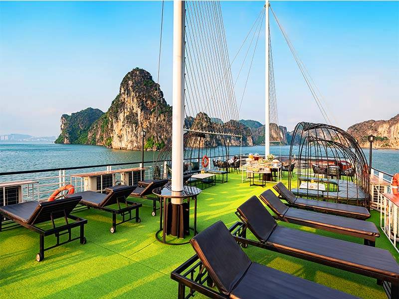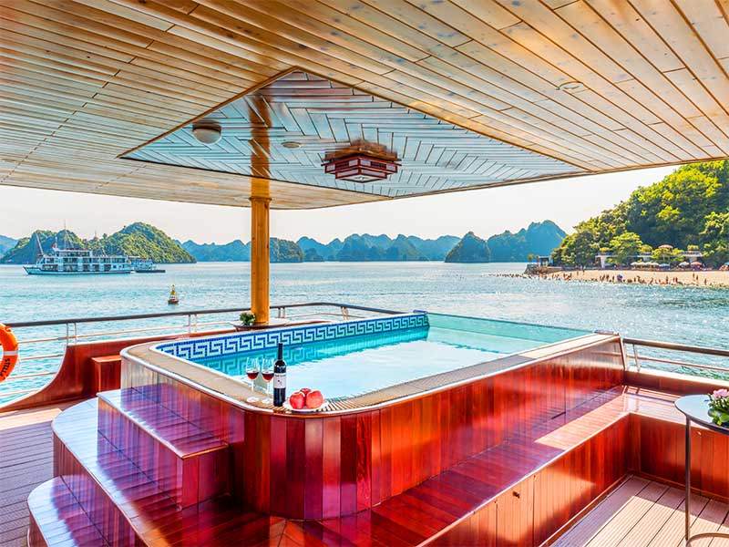 From the top of Titov island, you can enjoy the panoramuc view of Halong Bay with thousands of limestone. Swimming at Titov beach. Or enjoy the Jacuzzi on boat.