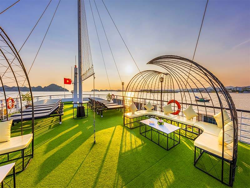 Attend a sunset party, complimentary variety of fruits, cakes, juices, tea. Enjoy the sunset the sunset while the cruise returns to Tuan Chau port.