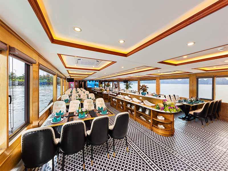 Have lunch on boat. Enjoy a buffet lunch at a luxury restaurant on cruise with special seafood of Halong. The cruise will passing the most beautiful spots in Halong Bay such as: Stone Dog, Stone Incense Burner & The Kissing Rocks...
