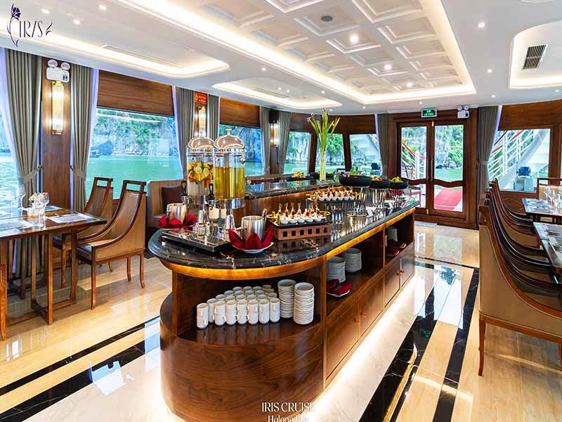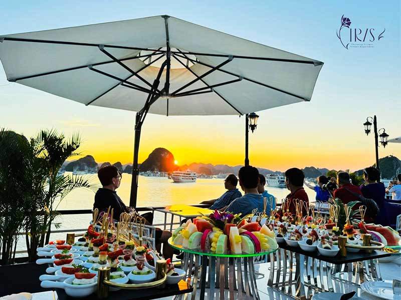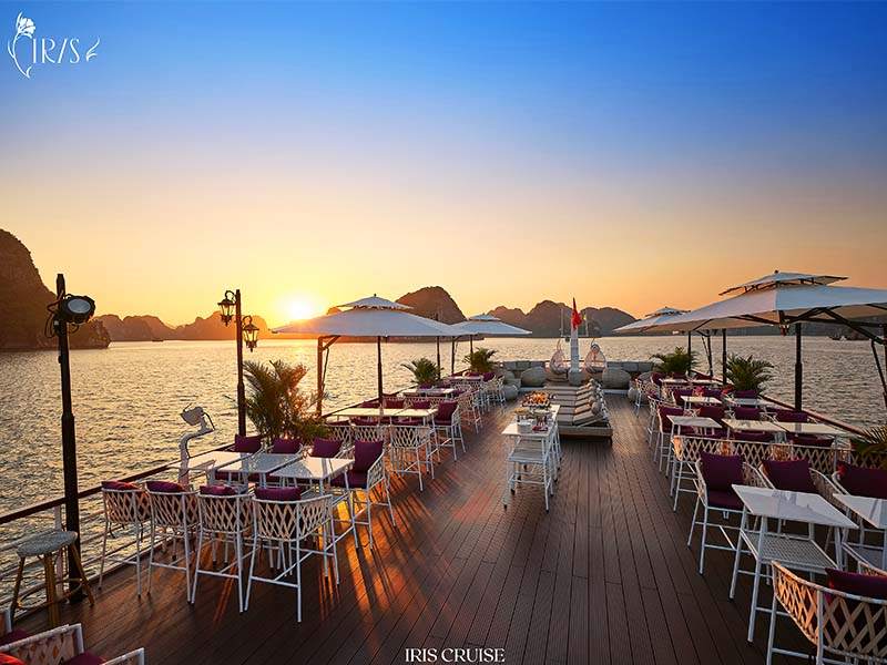 10:30 - 11:30: Welcome aboard IRIS Cruise at Halong Port and transfer to cruise by electricity carte. Boarding and enjoying welcomed drink. The cruise manager will do a short briefing of safety regulations and the trip schedule. Then enjoy the majestic scenery of hundreds of limestone mountains while cruising through Halong Bay.
