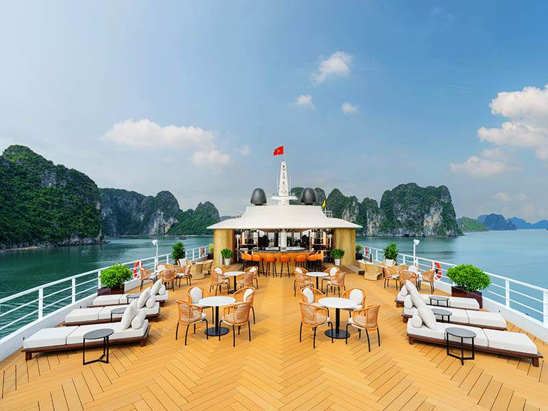 20:30 - 22:30: After the dinner, guests have free time amidst the peaceful ocean scene. Beside complimentary experiences like squid fishing, guests can enjoy spa services (with surcharge) to relax after a full day of exploration. If you wish to use the karaoke room located in the lower deck of the cruise, please contact the management to make reservations in advance (with surcharge). Various premium imported wines and spirits are also available to enjoy under the captivating night sky of Ha Long Bay.